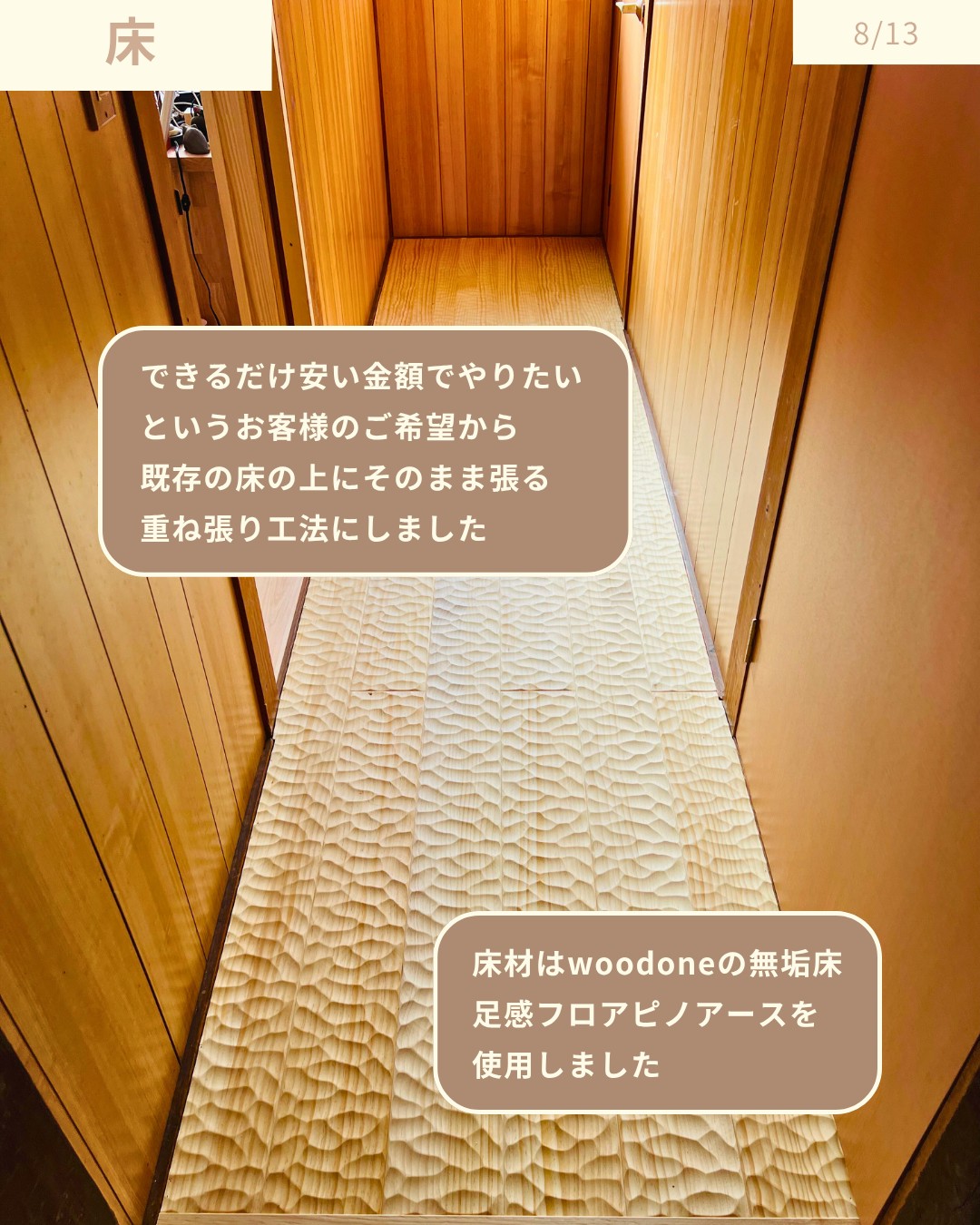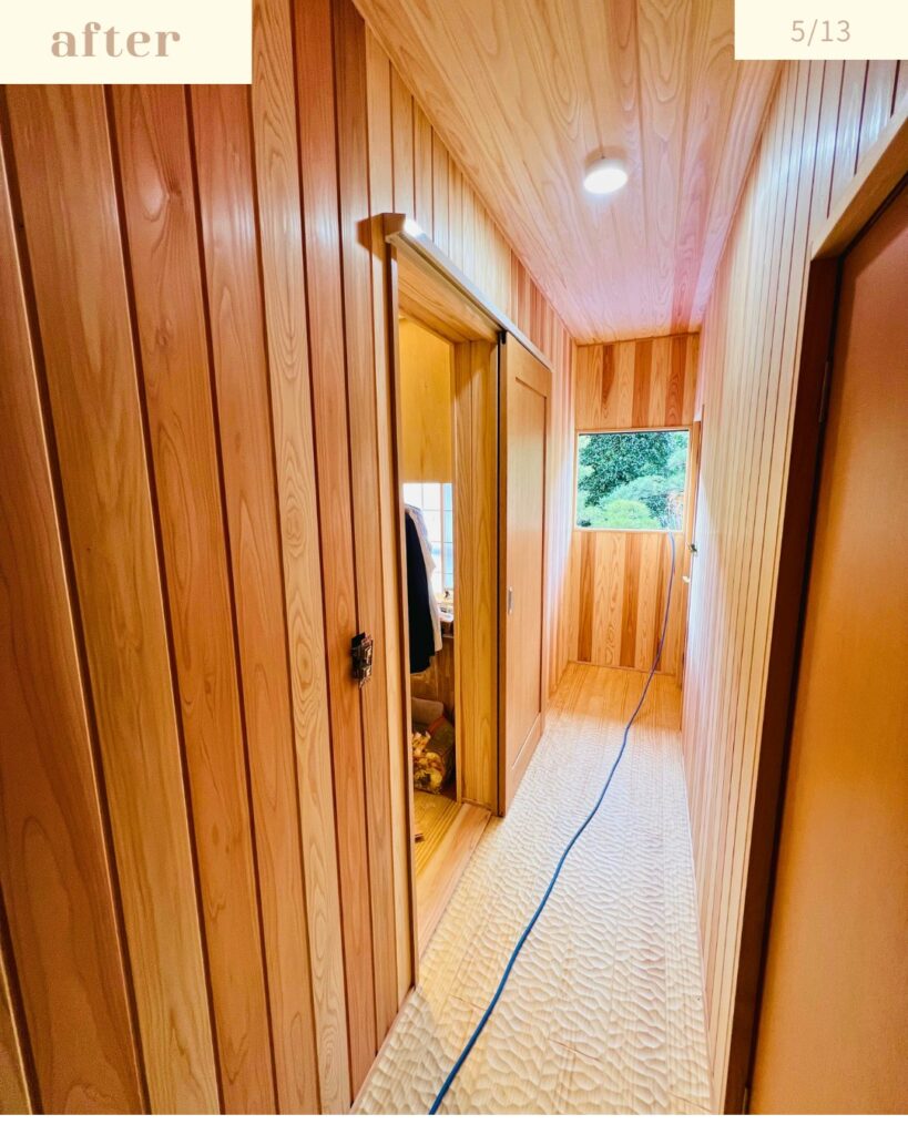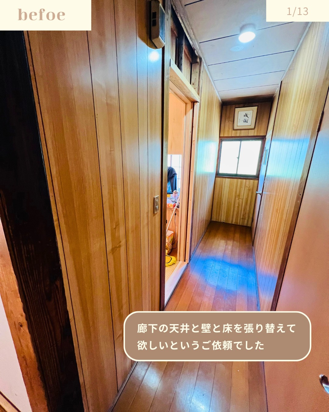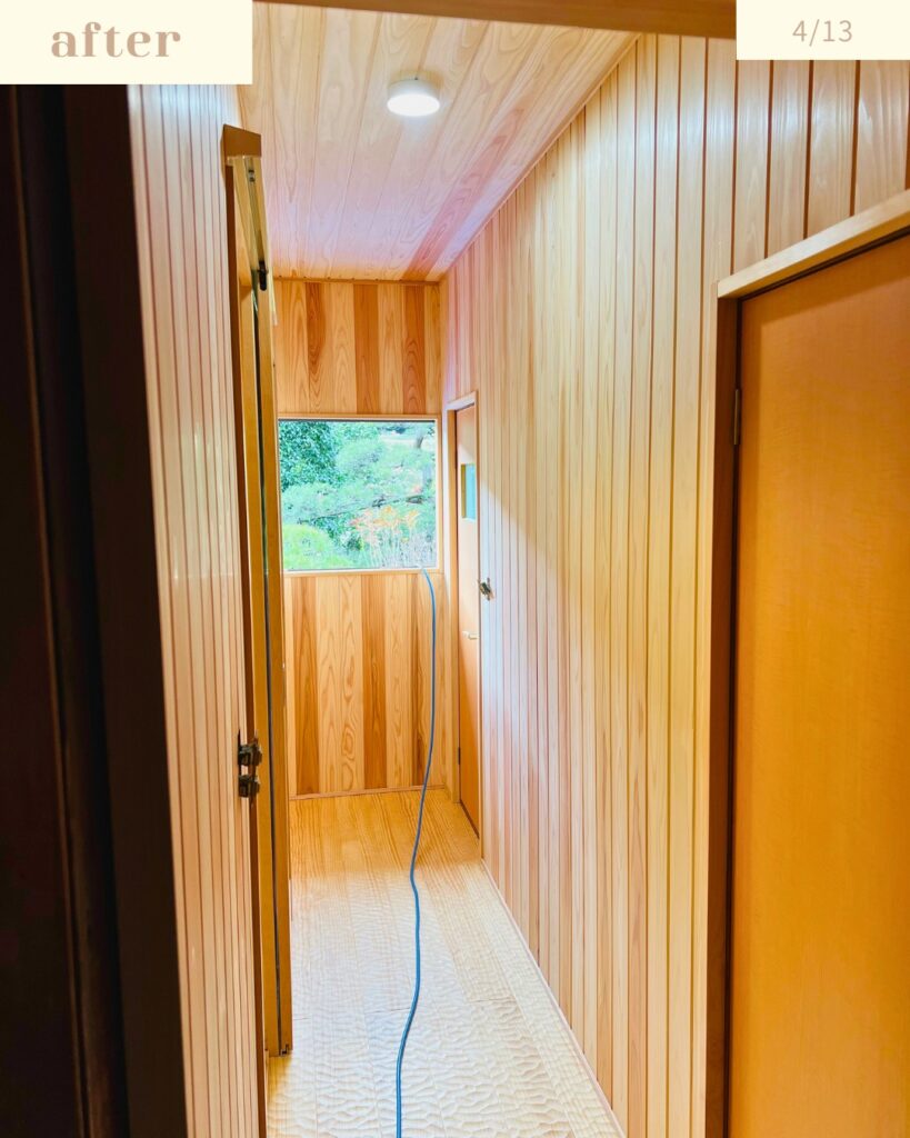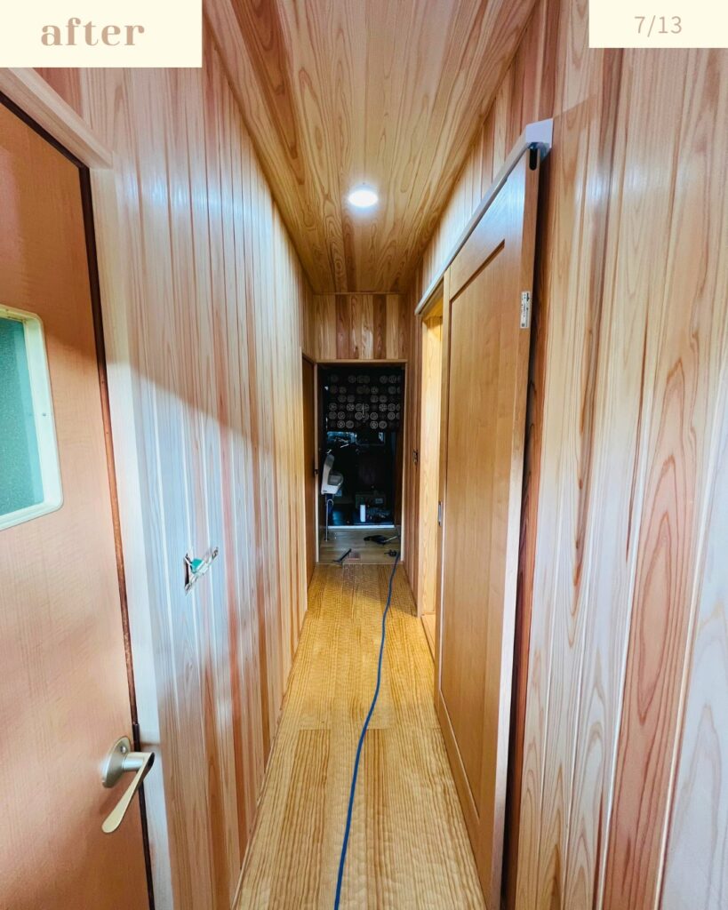 K様邸 廊下の床・壁張り替え工事 2024-08-01 2025-11-27 施工事例 #内装リフォーム#内装工事#壁#天井#床#廊下#張り替え工事 施工範囲 7畳(3.5坪) 施工費用 40万3000円 施工内容 壁板張り工事 床張り替え工事 施工ポイント 天井・壁の羽目板は八溝びじんを使用しています。 巾木・廻り縁・見切りはヒノキ材を使用しています。 床材はピノアース足感フロア(スプーン)・建具はウッドワン(woodone)ドレタスのアウトセットを使用しています。 建具の周りに取り付けた見切りの接合部・見切りと羽目板の接合部などくっつけるところは確実にくっつけて作業しています。 羽目板の張る順番も「色合いや木目」を考え、仕上がりをイメージしながら張っていますのでとてもキレイな仕上がりになります。 アウトセットの建て付けも隙間なく使いやすいように取り付けています! 施工事例 #内装リフォーム#内装工事#壁#天井#床#廊下#張り替え工事