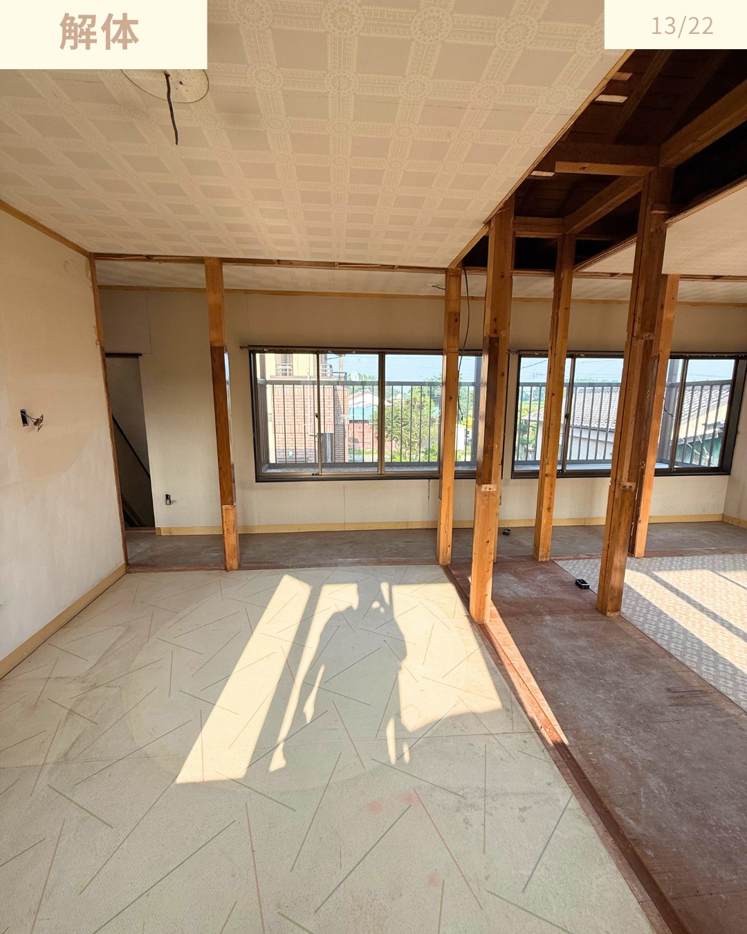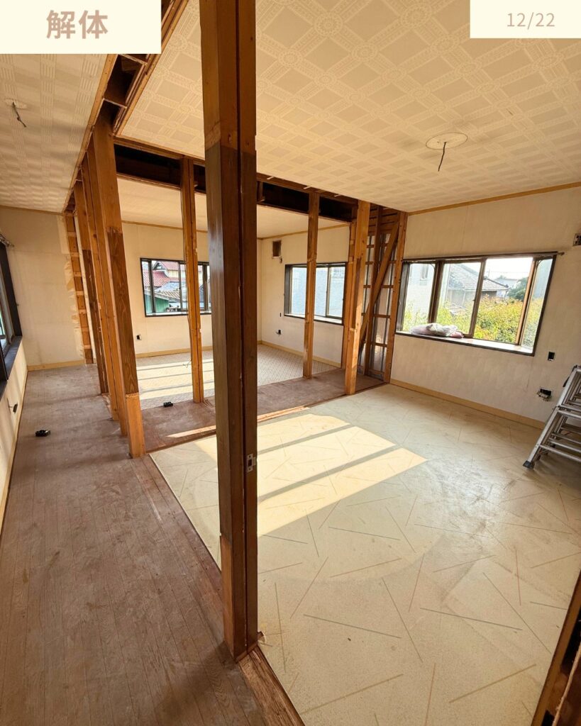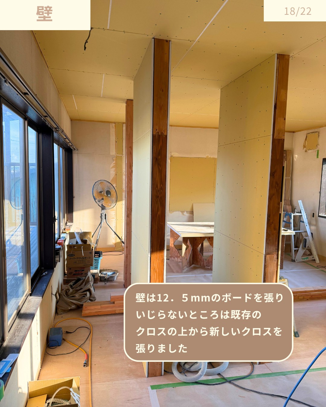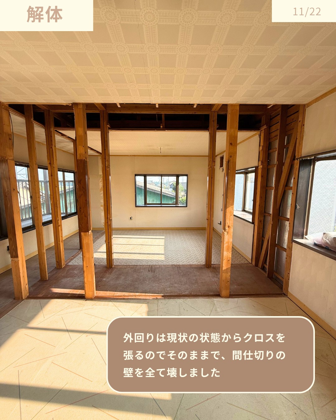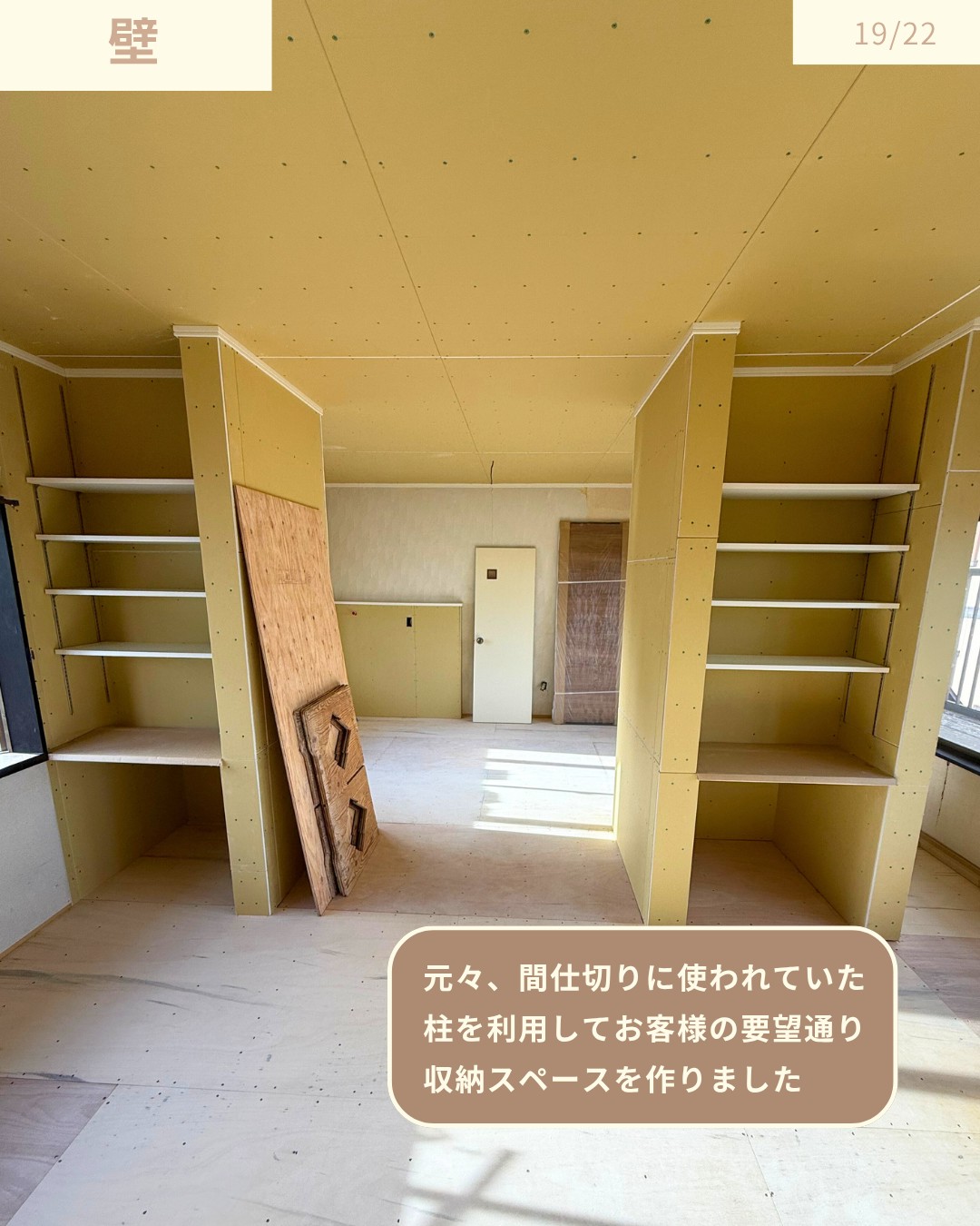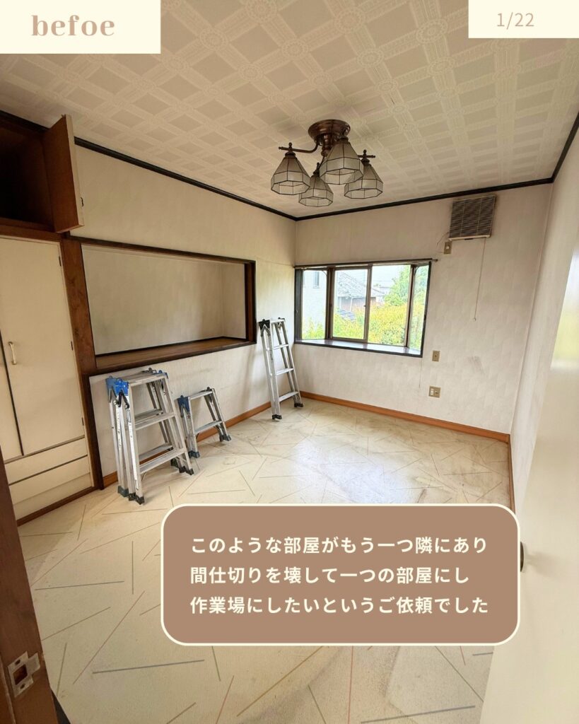 I様邸 作業場改修工事 2025-07-01 2025-11-27 施工事例 #作業場#内装リフォーム#内装工事#収納#壁#天井#床#張り替え工事#改修工事#解体工事#造作工事#間仕切り 施工範囲 18畳(9坪) 施工費用 192万4500円 施工内容 間仕切り・壁解体工事 床張り替え工事 天井張り替え工事 壁張り替え工事 収納造作工事 施工ポイント 床はかなりビクビクでしたが、大引はしっかりしていたので解体はせずにその上から下地を組み直しました。(解体をしてしまうと解体費や処分費など費用がかなり上がってしまうから) ビクビクを確実に平らにするために、レーザーで水平な墨を出しそれを基準に下地を作り直しました。 床材はクッションフロア、巾木はソフト巾木を使用しています。 費用をできるだけ抑えたいという施主様の要望がありましたので、そのまま残す壁はいじらずにその上から新しいクロスを貼る施工方法にしました。 間仕切りに使用されていた躯体を収納スペースとして活用しました。 レールはどこでも動かせるよう可動レールにしました。棚板はwoodoneの棚板を使用しています。 施工事例 #作業場#内装リフォーム#内装工事#収納#壁#天井#床#張り替え工事#改修工事#解体工事#造作工事#間仕切り