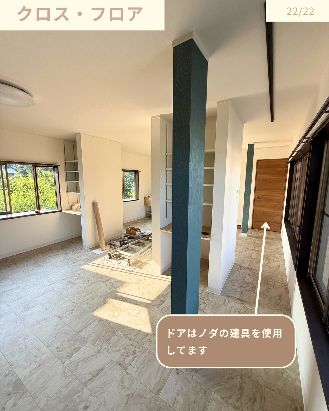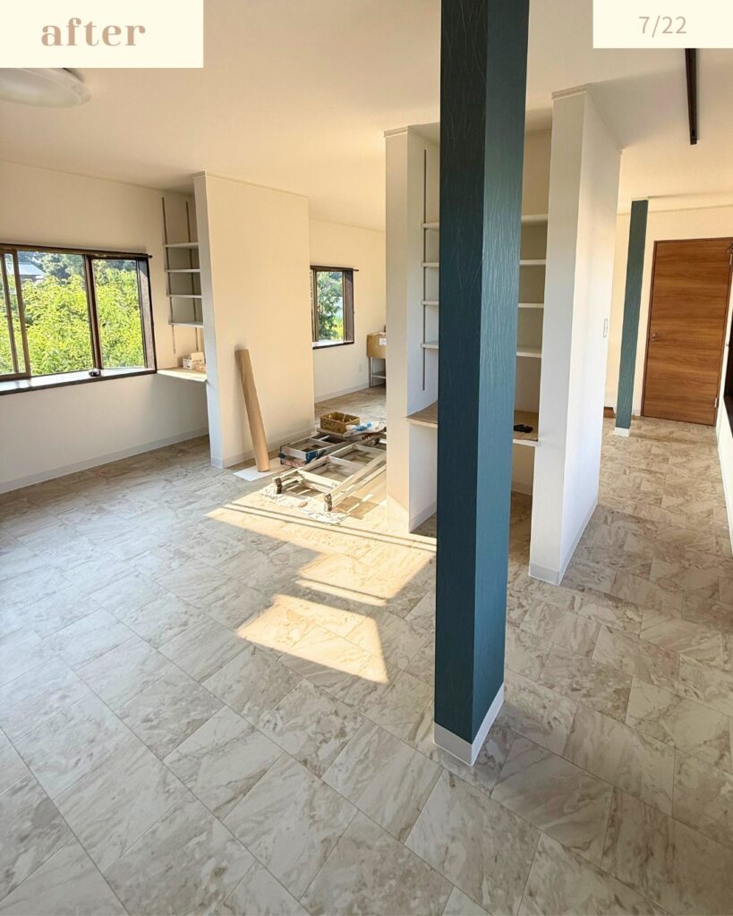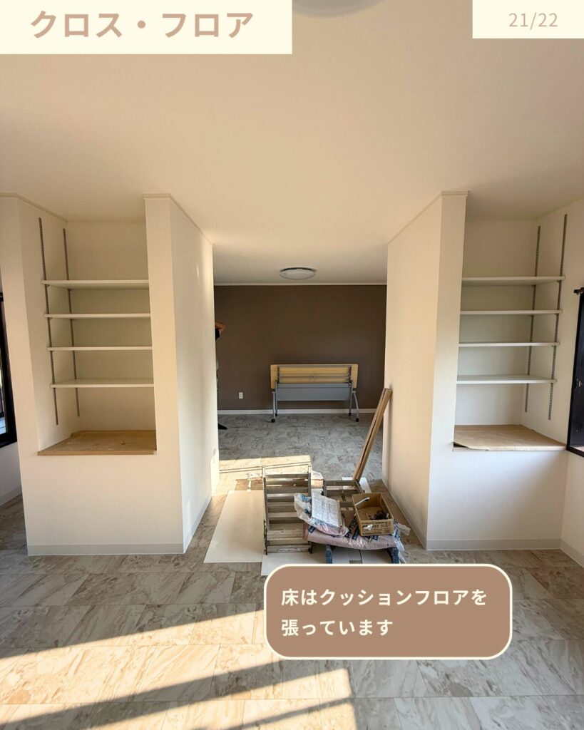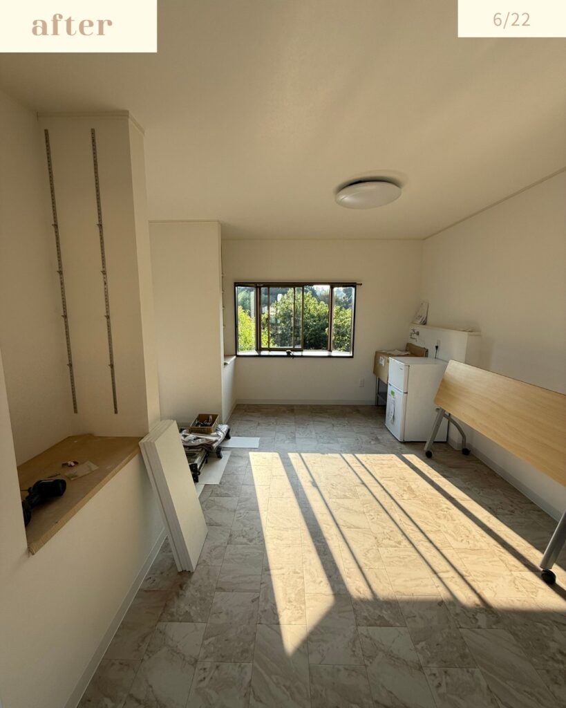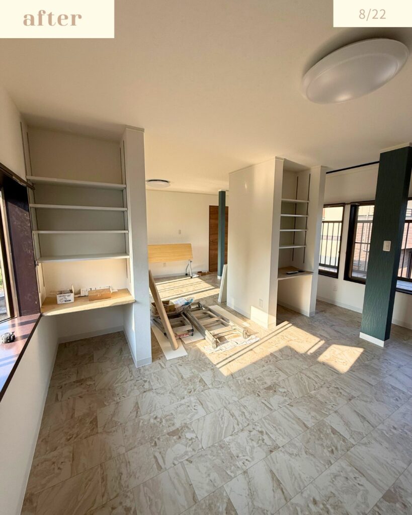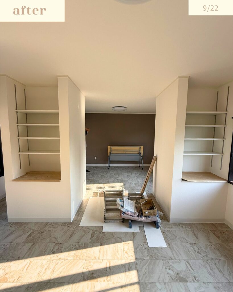 I様邸 作業場改修工事 2025-07-01 2025-11-27 施工事例 #作業場#内装リフォーム#内装工事#収納#壁#天井#床#張り替え工事#改修工事#解体工事#造作工事#間仕切り 施工範囲 18畳(9坪) 施工費用 192万4500円 施工内容 間仕切り・壁解体工事 床張り替え工事 天井張り替え工事 壁張り替え工事 収納造作工事 施工ポイント 床はかなりビクビクでしたが、大引はしっかりしていたので解体はせずにその上から下地を組み直しました。(解体をしてしまうと解体費や処分費など費用がかなり上がってしまうから) ビクビクを確実に平らにするために、レーザーで水平な墨を出しそれを基準に下地を作り直しました。 床材はクッションフロア、巾木はソフト巾木を使用しています。 費用をできるだけ抑えたいという施主様の要望がありましたので、そのまま残す壁はいじらずにその上から新しいクロスを貼る施工方法にしました。 間仕切りに使用されていた躯体を収納スペースとして活用しました。 レールはどこでも動かせるよう可動レールにしました。棚板はwoodoneの棚板を使用しています。 施工事例 #作業場#内装リフォーム#内装工事#収納#壁#天井#床#張り替え工事#改修工事#解体工事#造作工事#間仕切り